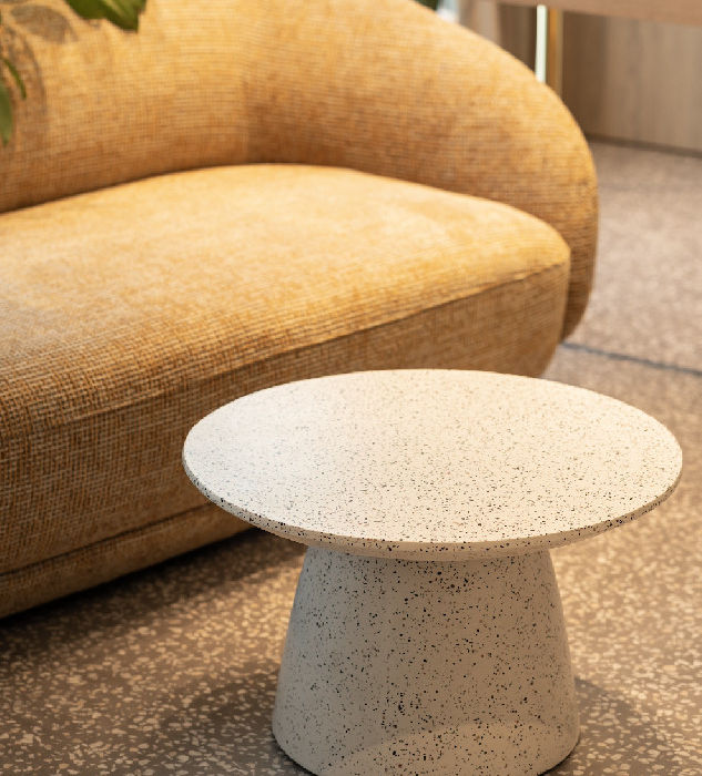 丸みのあるソファとテーブルが柔らかい印象を与えている待合エリア。観葉植物がアクセントを加え、リゾートを感じさせる上質な空間をイメージしています。